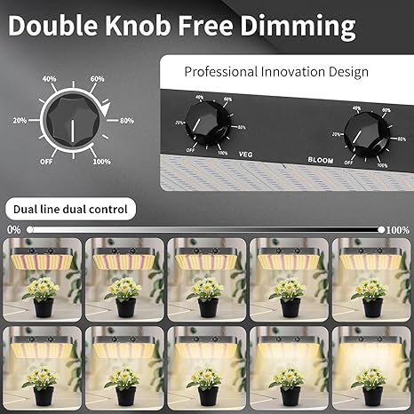 - 【PATENT DESIGN】2024 Newly upgraded grow lights. Equipped with two new adjustment knobs that allow for precise control of brightness (0-100%) and the selection of growth modes for all stages, providing more thoughtful care for your plants. Suitable for all types of plants