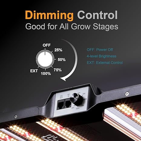- 3. Flexible Dimming & Daisy Chain: Features a dimming knob with 4 levels (25%/50%/75%/100%) for versatile growth stages, and a daisy chain function to connect up to 50 lights with just one socket.