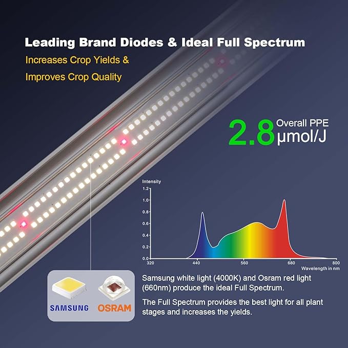 - 【Full Spectrum Grow Light】:These diodes provide optimal light-spectrum coverage, offering more power for your blooms and maximum PAR output at various distances.