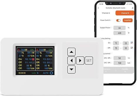 - Two Control Zones: Equipped with two control zones to manage the brightness and lighting time of the grow lights in different growth stages. It can control up to 75 high-power LED grow lights at the same time.