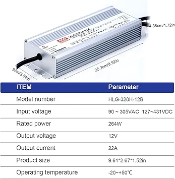 HLG-320H-12B 12V 22A 320W LED Driver, IP67 Waterproof, High Efficiency, Compact Design, Exceptional Reliability, for LED Lighting, Industrial Automation, Outdoor Applications