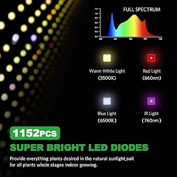 - Full spectrum LED grow light: High efficiency Samsung 281B LED diodes, simulate natural sunlight with 3500K, 6500K, red 660nm and IR 760nm. Ideal for plants whole stages from seed to flower, achieve maximum yield, much better than traditional HPS systems