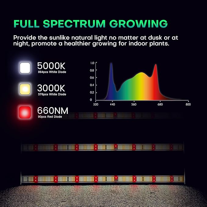 - Efficient Heat Dissipation and No Noise: The LED grow lights are made of lightweight aluminum bars, gas reflow design, space between the light bars. Which has efficient heat dissipation and cooling functions. It’s powerful heat dissipation ability that no need to buy more cooling devices. No fan, so no noise.