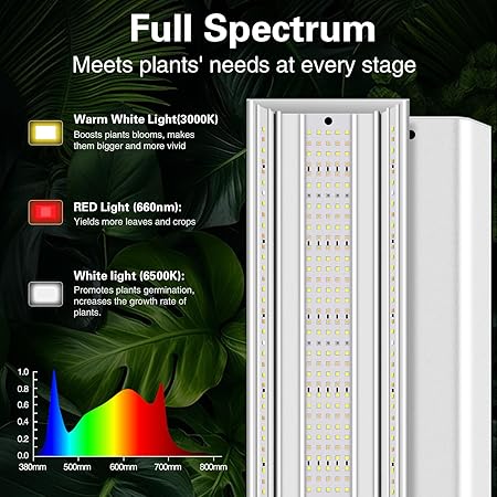 - Tri-Directional LED Panel Design for Full Spectrum Grow Lights: LPMZMBL Full Spectrum Plant Grow Lights equipped with 392 LEDs, white light (6500k), warm white light (3000k) and red white (660nm) , mimic the natural sunlight, ultra-thin grow light panel covers 24″x6″ and height adjustable, which is lightweight and has great heat dissipation, tri-directional LED panel design can provide a wider range of light coverage maximize photosynthesis for all growth stages, using 40% less energy than traditional grow lights(50,000+ hours lifespan).