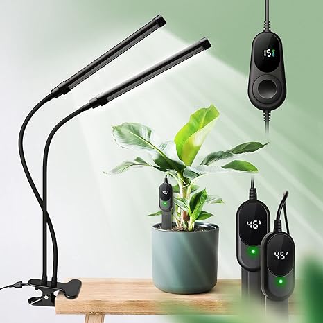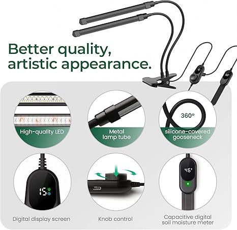 - 【Better Usability】This plant light uses knobs to control brightness and the timer, with a display screen showing current brightness level, timing, soil moisture, etc., making it intuitive and convenient to use. The two-headed lamp allows you to take care of plants in different areas at the same time.The enlarged clip allows for easy attachment to a desk or table, while the silicone-wrapped gooseneck tube allows you to adjust the angle of the light to any position.