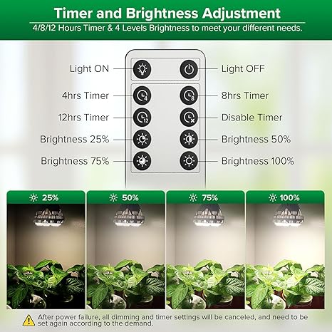 - 4000K DIMMING & TIMING: Remote Control Available – No need to unplug/re-plug! It is designed with a 4, 8, 12 timing function and offers 4 Dimming 4000K brightness levels from 25% to 50% to 75% to 100%. You don’t need to move your plants or the light bulb, just use the remote control to chose the most suitable brightness for your plants growth