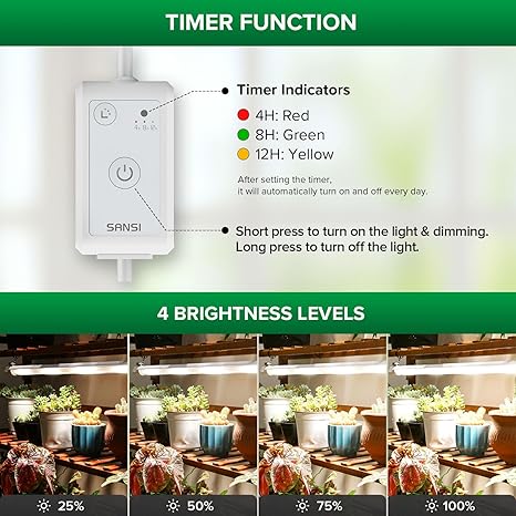 - 4/8/12 HRS AUTO ON/OFF TIMER & 4 DIMMING LEVELS: The LED flower lamp operates from a built-in timer with 3 modes cycle timing function which stays on for 4/8/12 hours and off for 21/18/12 hours. The indoor plant lights for indoor plants full spectrum offer 4 level brightness settings to different plants requirements ranging from 25%, 50%, 75% to 100%