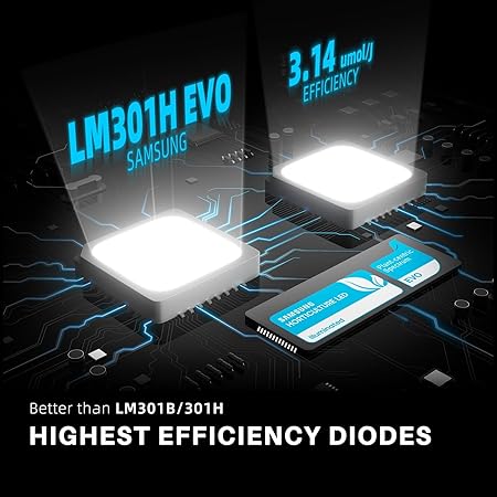 - 𝐂𝐔𝐓𝐓𝐈𝐍𝐆-𝐄𝐃𝐆𝐄 𝐋𝐄𝐃 𝐂𝐇𝐈𝐏𝐒 𝐅𝐎𝐑 𝐔𝐍𝐑𝐈𝐕𝐀𝐋𝐄𝐃 𝐏𝐄𝐑𝐅𝐎𝐑𝐌𝐀𝐍𝐂𝐄: Cutting-Edge LED Chips for Unrivaled Performance:Introducing the Samsung LM301H EVO LEDs. Boasting an impressive efficiency rating of 3.14 µmol/J PPE per diode , these LEDs outshine even the renowned LM301B, LM301H, and Bridgelux 3030 chips in terms of sheer effectiveness, no fan, completely silent. EVO LEDs redefine plant growth enhancement. With superior light quality and an increased light output per L