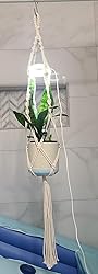 This set of macrame plant hangers is really cute. They're really simple in design but add such a nice boho vibe. The set of grow lights that come with this are really nice as well. The different options of lighting they provide is top tier. I've had several grow lights and these really come with all the bells and whistles. They have the timer, brightness control and even a variety of light spectrums which is pretty extensive in terms of options, so I was really happy with that. They definitely will help the plants thrive during the winter months. The wires on these lights are also long enough for functionality. They are a tad longer than most smaller lights of this size that I've used which is really nice that this was thought through in the design since this would be hanging so it would need to be longer to reach outlets. The way the lights attach to the hangers is just by being placed on the ring on the top of the hangers and I found that it was a bit awkward. It was a rather difficult to get it to look flush but at least it felt secure and didn't feel like they would fall through onto my plants. See photo for reference. Another thing to be aware of is that because that ring is there, it kind of restricts the width of these hangers causing them to be a bit on the narrower side so be aware of this fact when buying for your plants. It worked well for me but I'm not sure I would recommend it for use with bigger and bushier plants. Overall, I really like this set of hangers with grow lights for the quality of the lights and the super cute design and would recommend them to others.